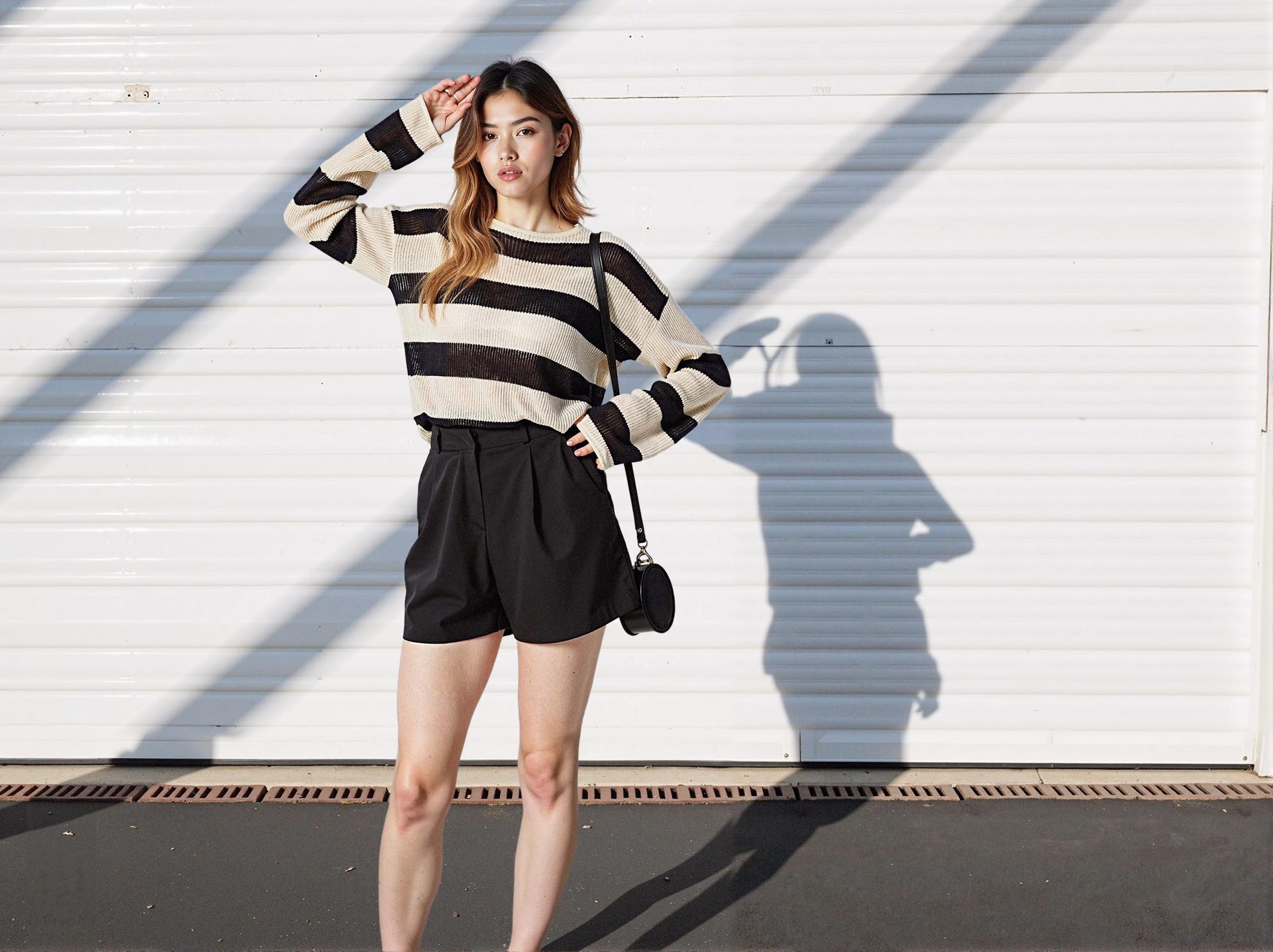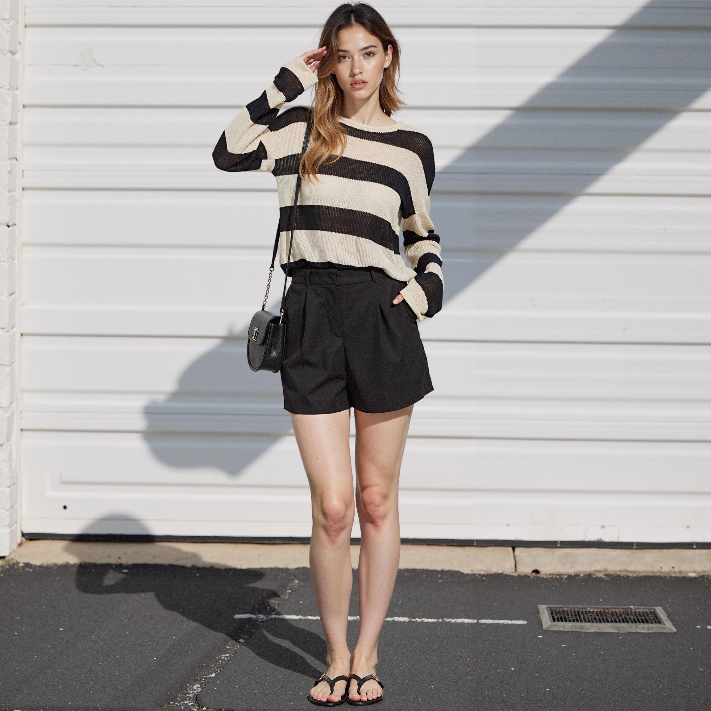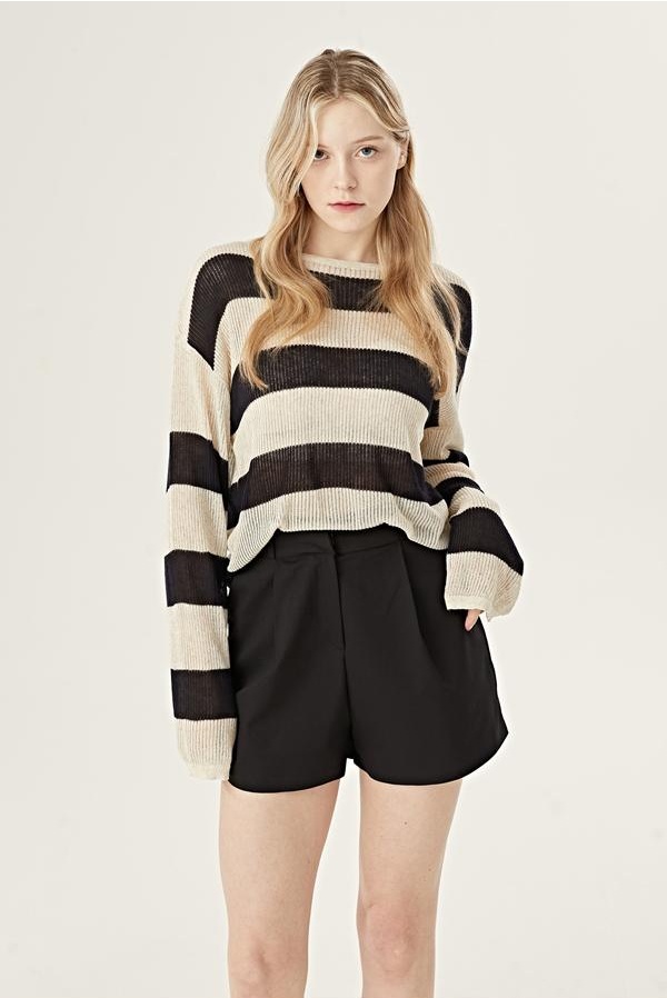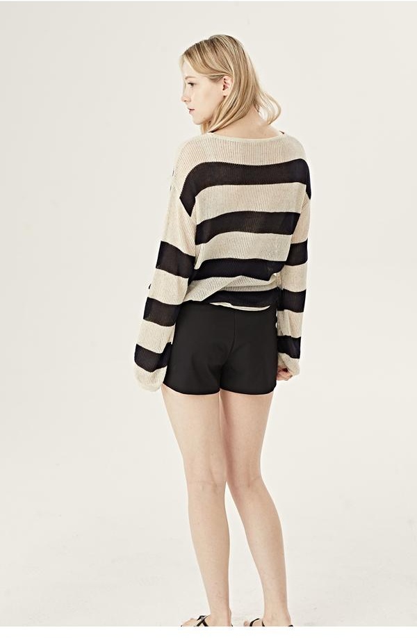 시스루 니트 특유의 은은한 비침과 가벼운 질감이 블랙 쇼츠와 함께 도시적인 무드를 완성합니다. 스튜디오 조명, 모델의 포즈, 구도까지 브랜드가 의도한 무드를 정제된 방식으로 보여주며, 전통적인 룩북의 강점을 확인할 수 있습니다.