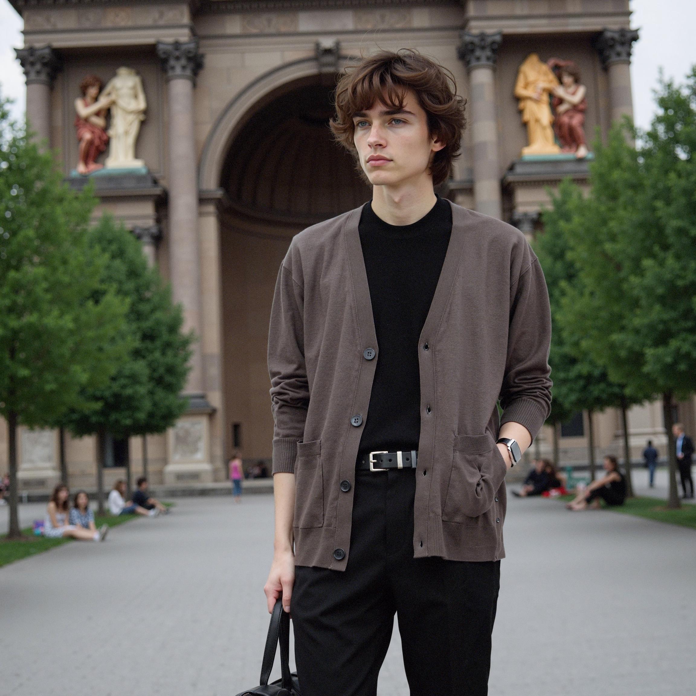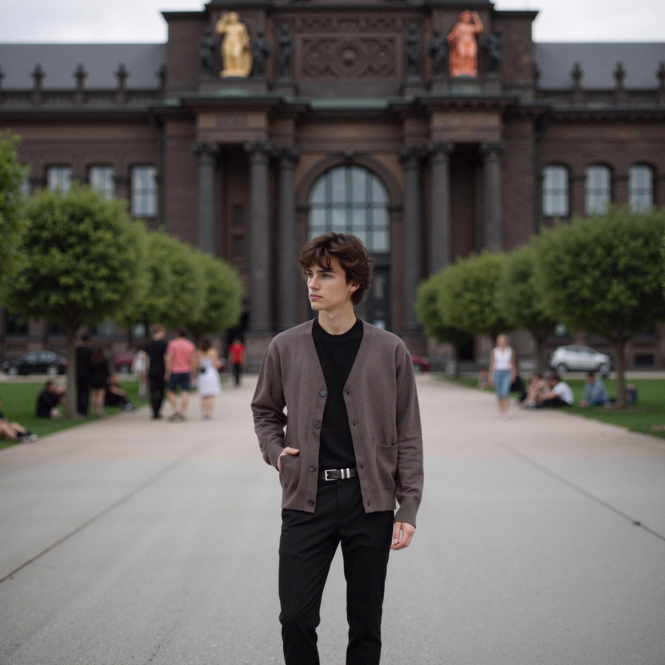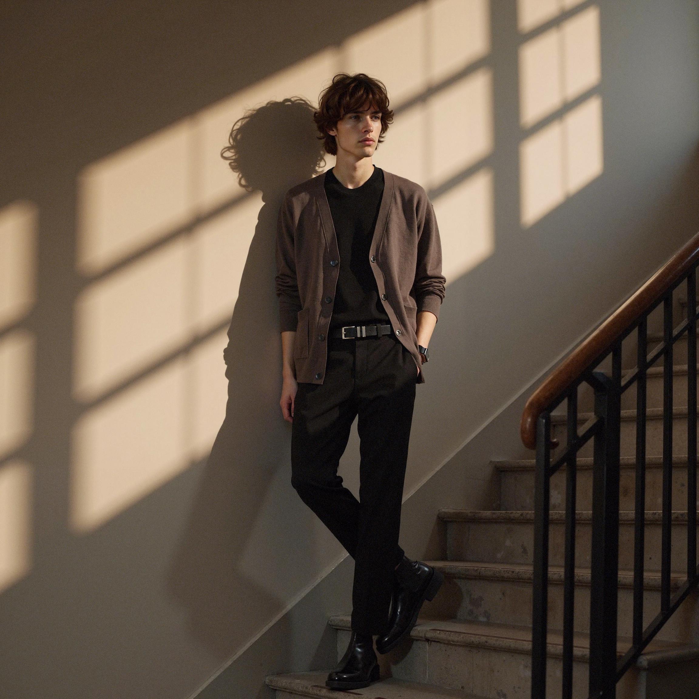해리슨 포켓 가디건의 착장 이미지 몇 장만 있다면 준비는 충분했습니다. 저는 원하는 배경, 모델 포즈, 의상 스타일까지 세밀하게 요청할 수 있었습니다. 예를 들어, 캐주얼하면서도 편안한 일상 룩을 연출하고자 "도심 속 스트리트 감성", "따뜻한 햇살 아래 편안한 무드"와 같은 배경 키워드를 입력했습니다. 그 결과는 다음과 같았습니다.