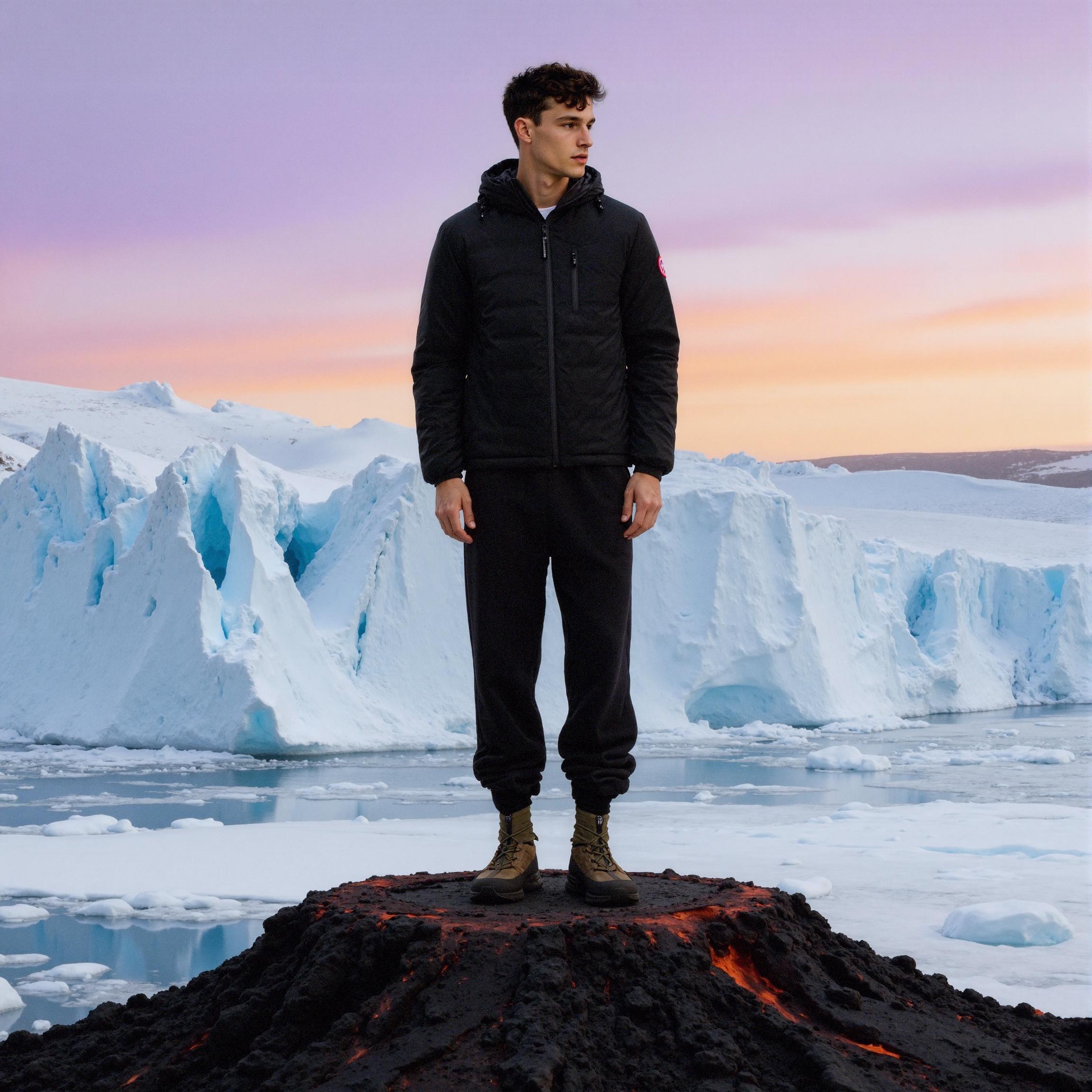 왼쪽 팔에 위치한 Arctic Program 패치는 브랜드 상징 역할 - 환경 기반의 화보 구조: