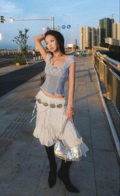 - 예를 들어, 레이스 블라우스에 데님 재킷을 매치하는 방식입니다.