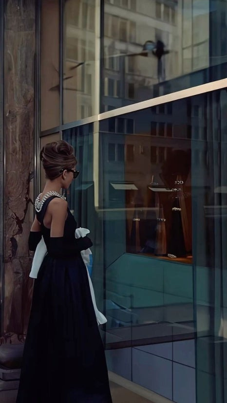 맨해튼의 티파니 매장 앞, 검은색 드레스를 입고