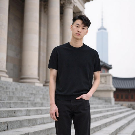 이번에는 **Maison Margiela(메종 마르지엘라)**의 청청패션 티셔츠와 바지를 LaonGEN 이용해 패션 화보로 만들어봤습니다.전통을 해체하고 재구성하는 메종 마르지엘라의 철학이 담긴 이번 컬렉션을 A