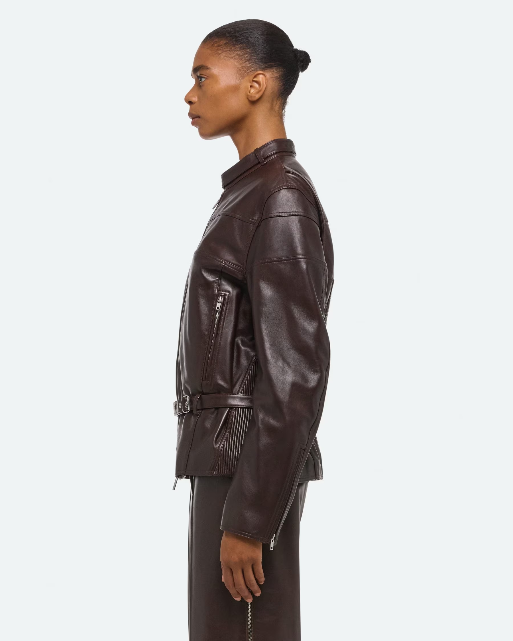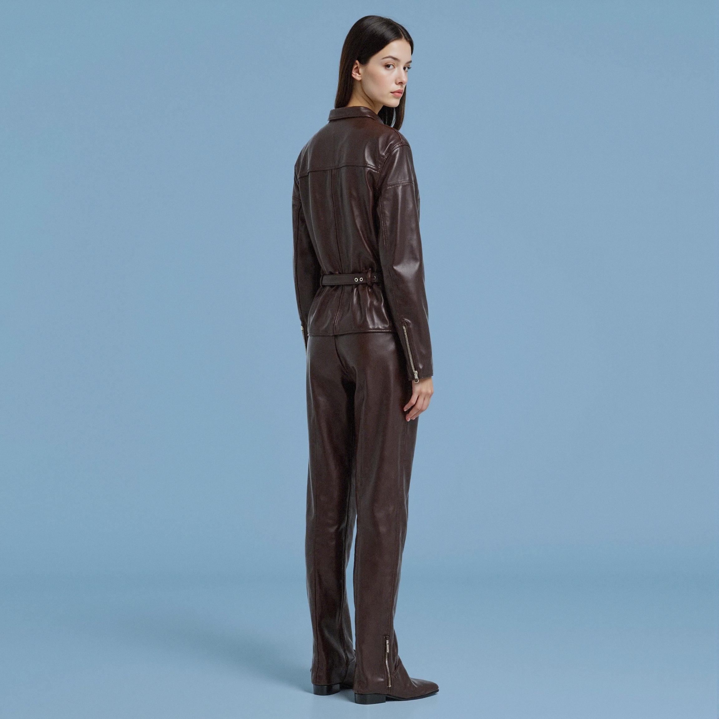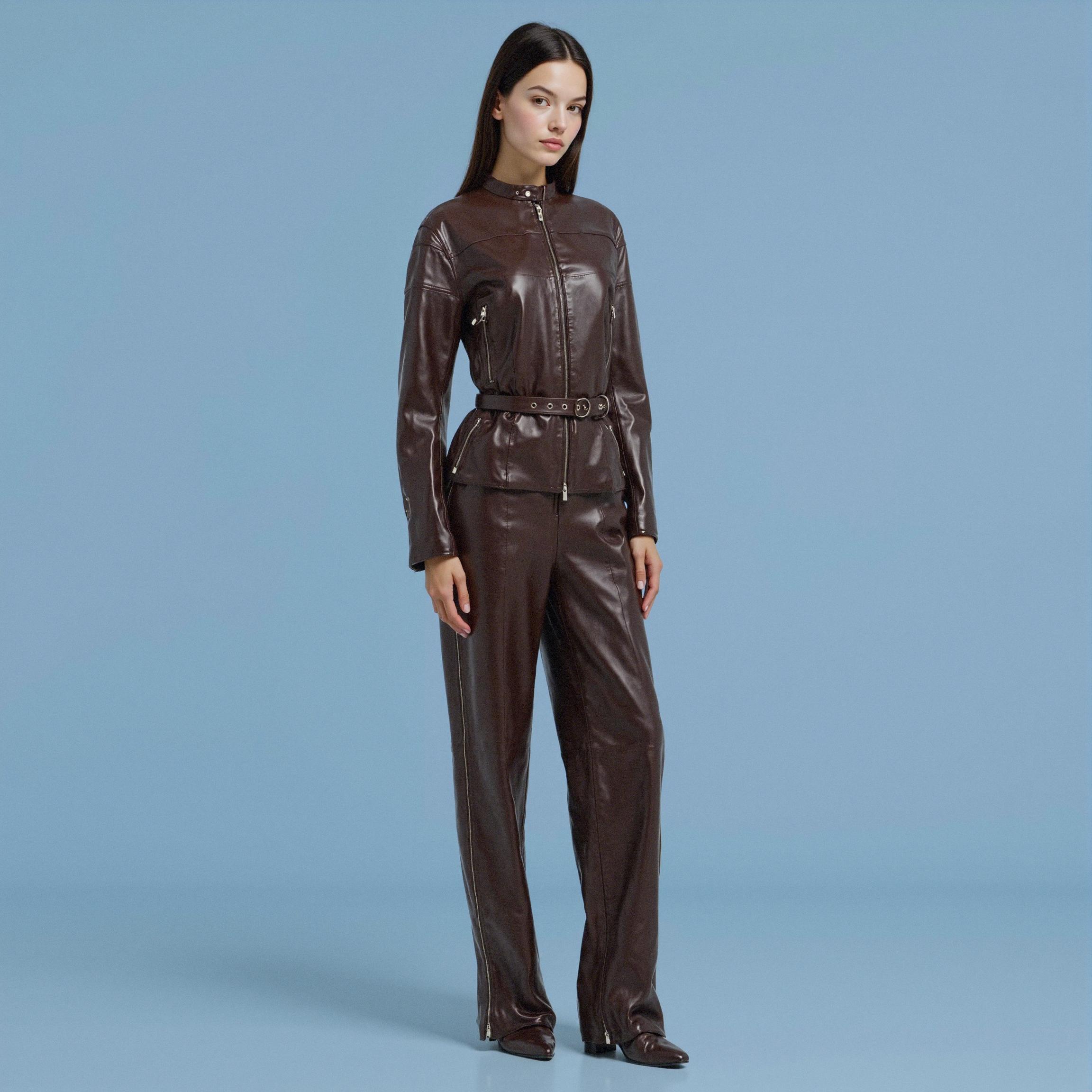 이번 시즌을 대표하는 룩은 다크 브라운 레더 셋업입니다.