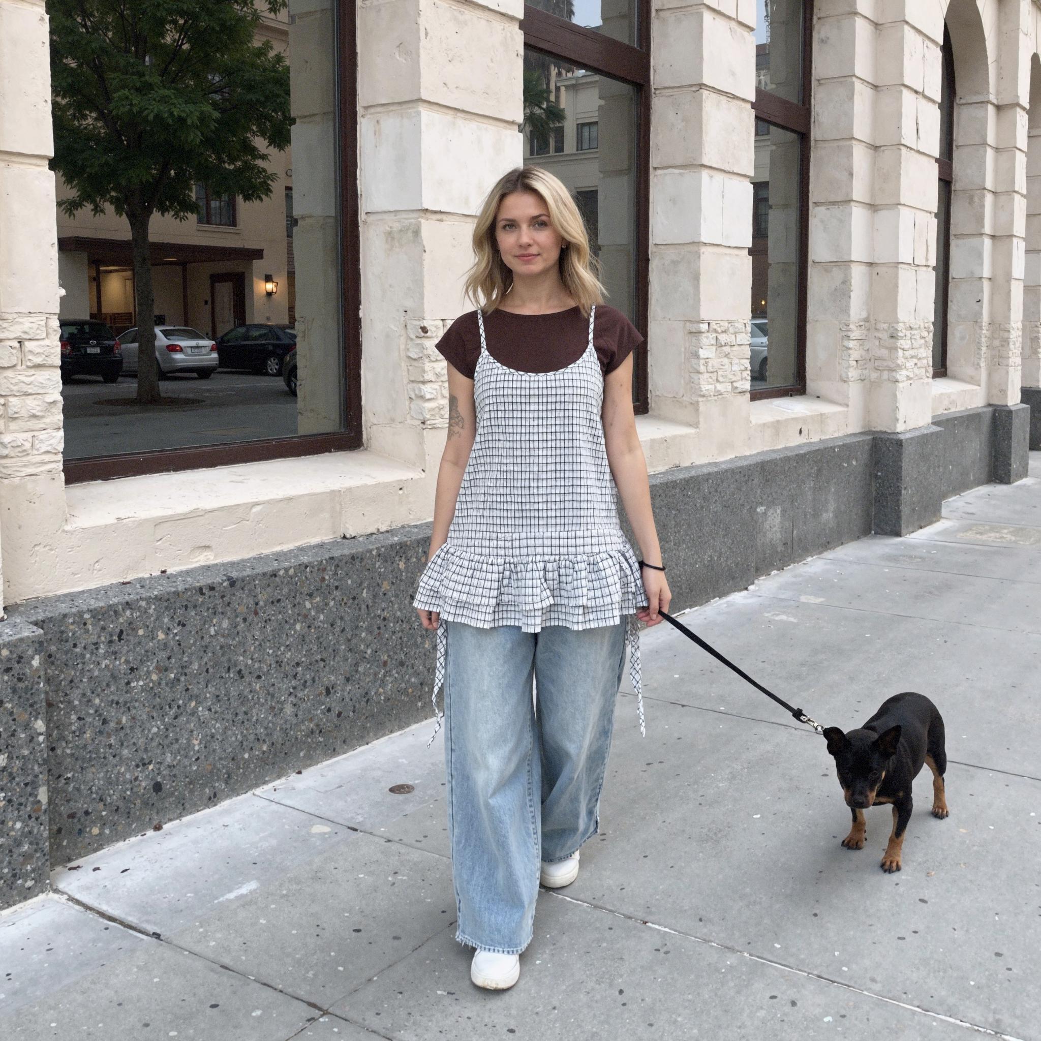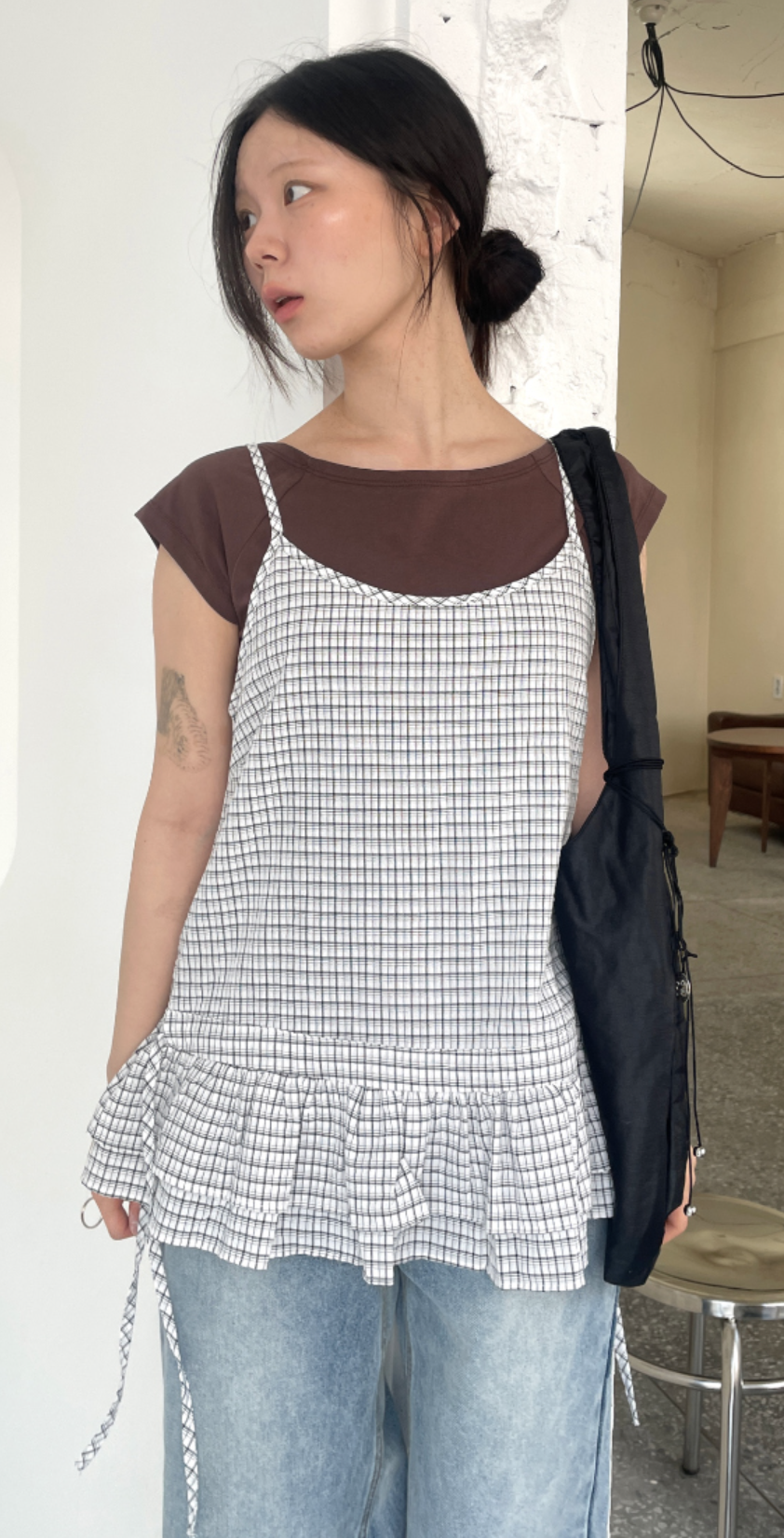 LaonGEN AI로 새롭게 선보이는 오뉴이 체크 스트링 뷔스티에 원피스 스타일링
