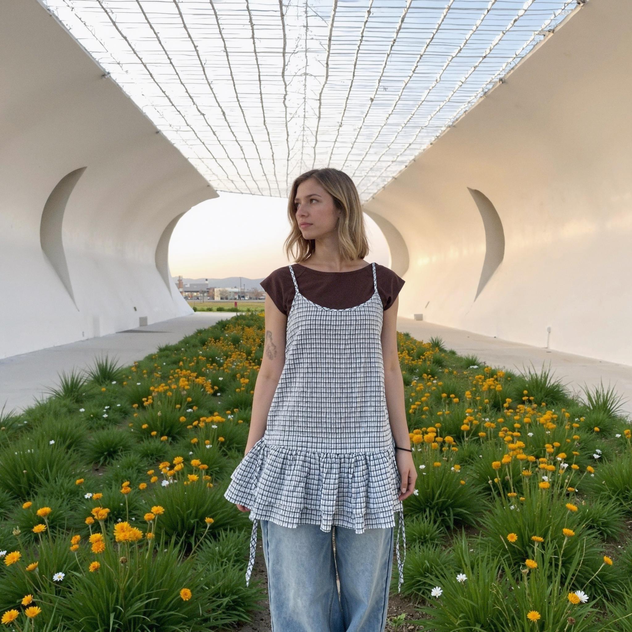 LaonGEN은 패션 분야에 특화된 AI 기술로 브랜드와 제품의 본질을 담아내는 시각적 콘텐츠를 제작합니다. 체크 패턴의 텍스처와 원피스의 실루엣을 정확하게 인식하고 자연스럽게 재현하는 능력이 돋보입니다.