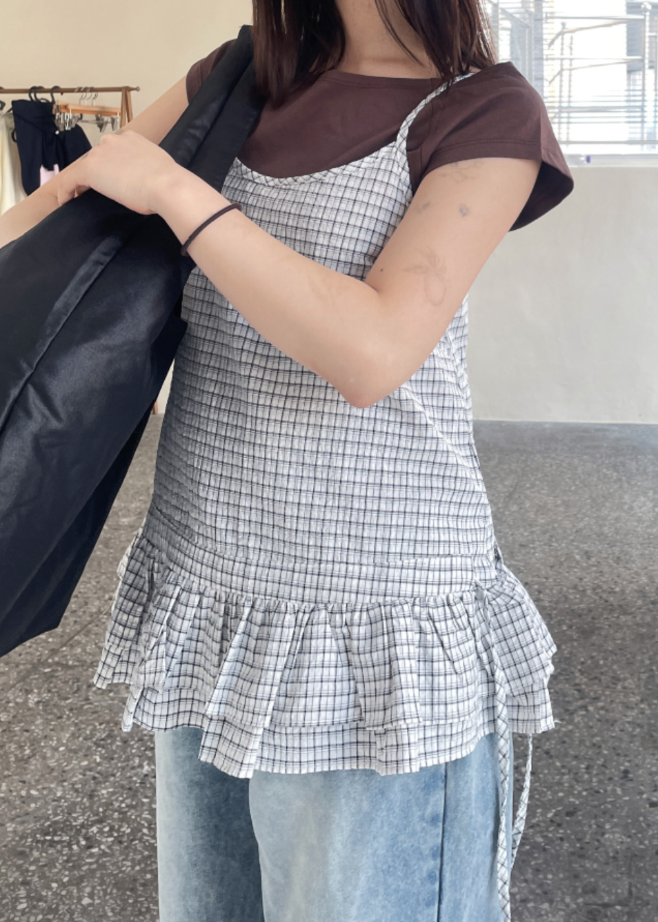 ✔ 화이트 베이스에 모던한 체크 패턴으로 깔끔하고 세련된 인상 ✔ 허리 스트링으로 체형에 맞게 조절 가능한 실루엣 ✔ 러플 디테일로 여성스러운 분위기 연출 ✔ 단독 착용은 물론 레이어드 스타일링에도 활용도 높음