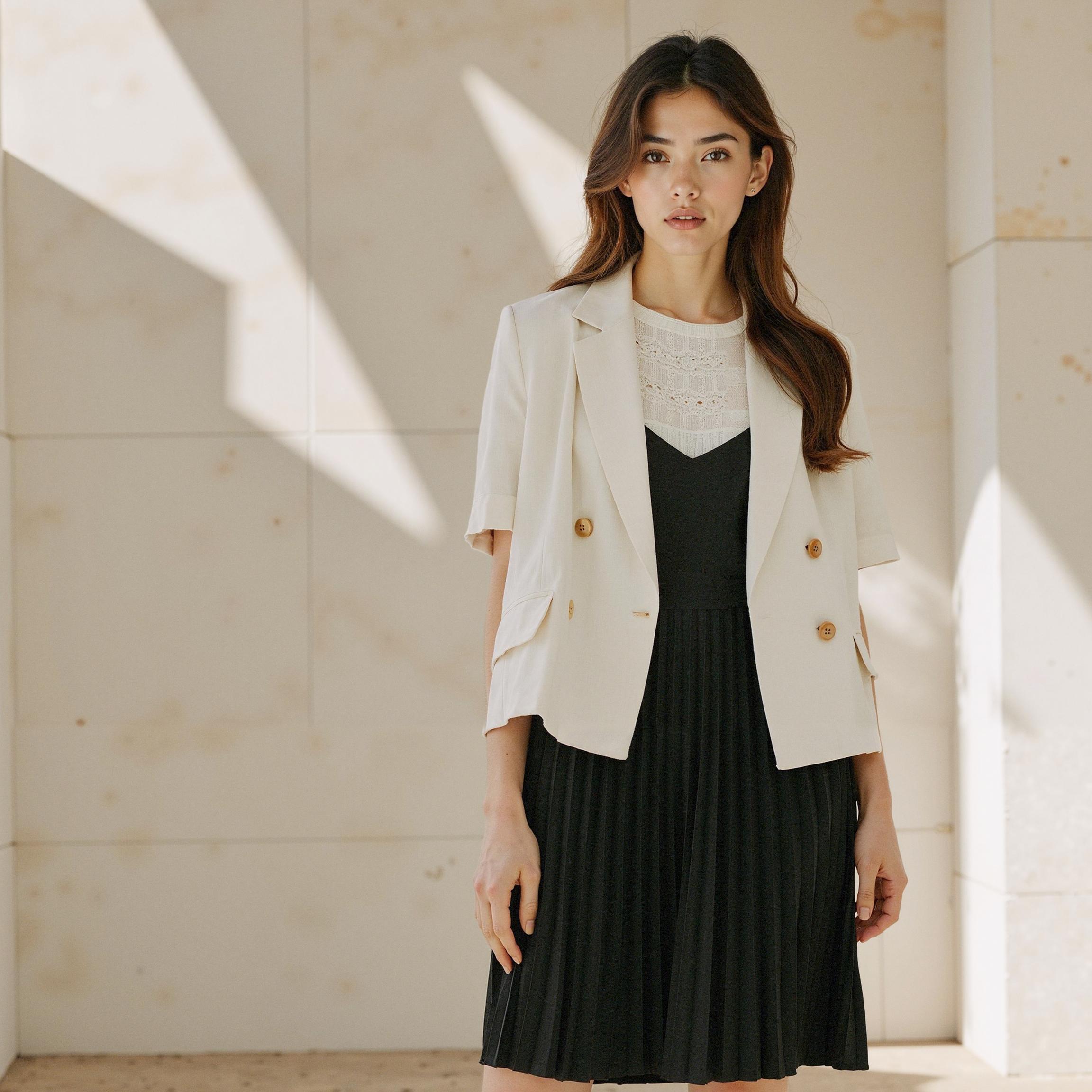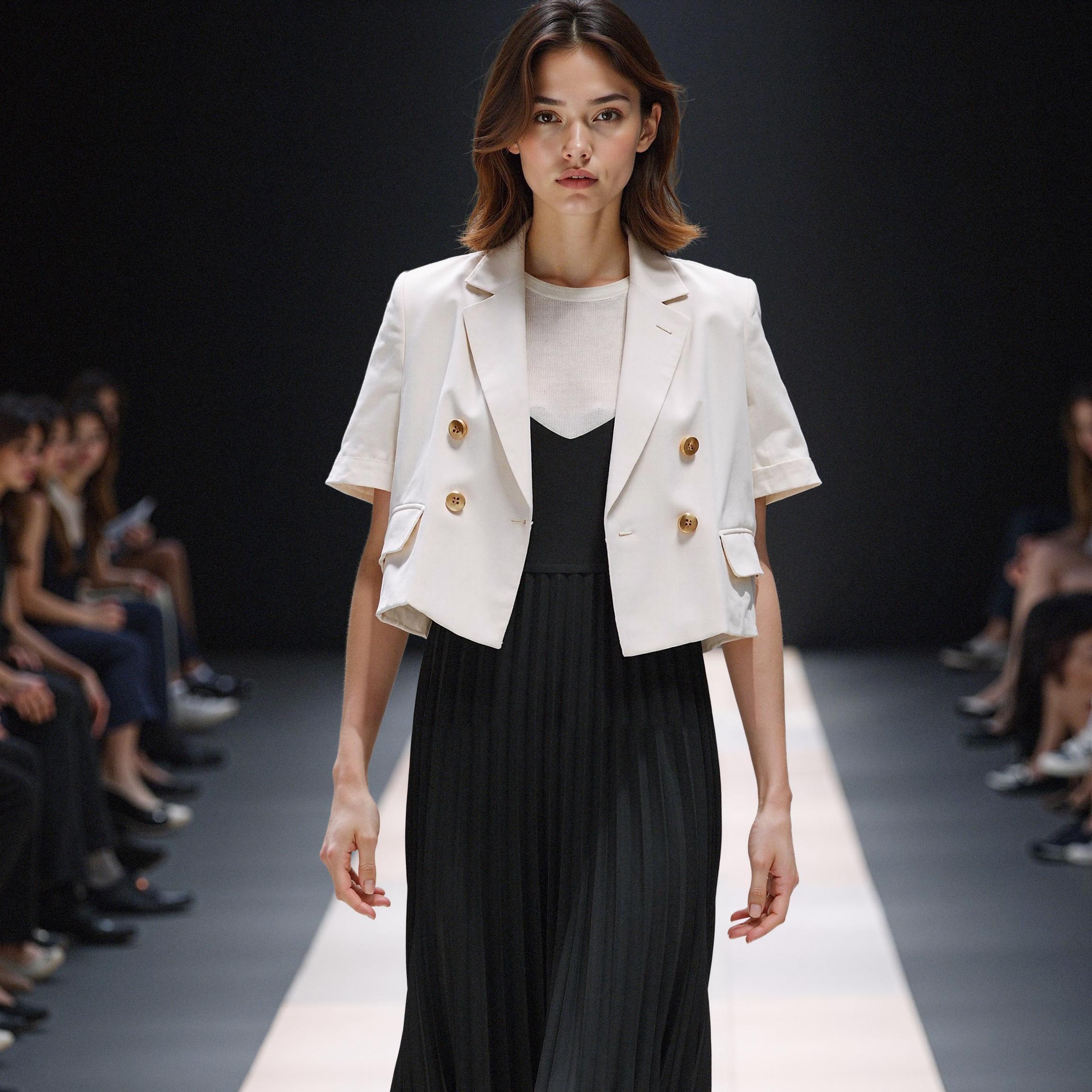 골드 버튼의 질감과 위치, 라펠의 형태까지 세밀하게 재현되었습니다. 이 정도 디테일이면 상품 상세페이지나 브랜드 룩북에 충분히 활용 가능한 퀄리티입니다.