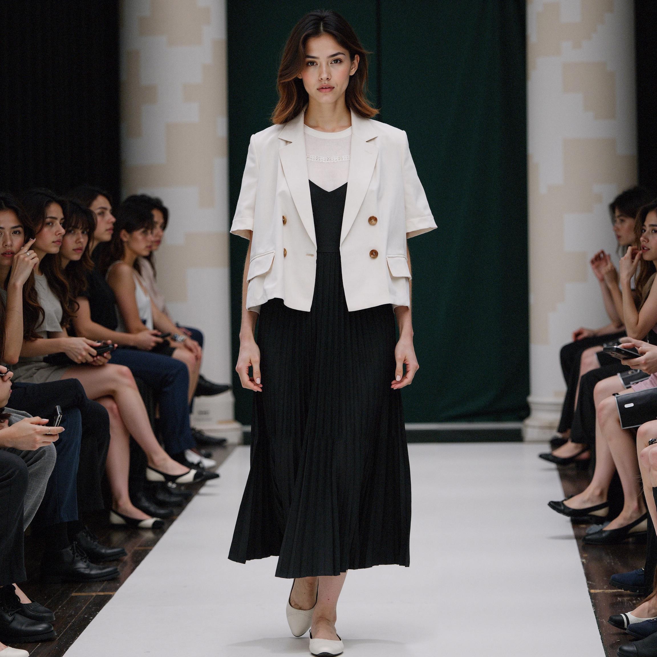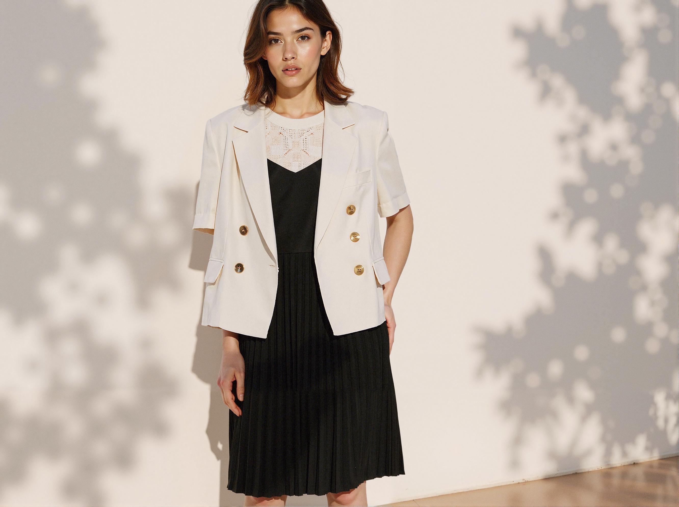 골드 버튼의 질감과 위치, 라펠의 형태까지 세밀하게 재현되었습니다. 이 정도 디테일이면 상품 상세페이지나 브랜드 룩북에 충분히 활용 가능한 퀄리티입니다.