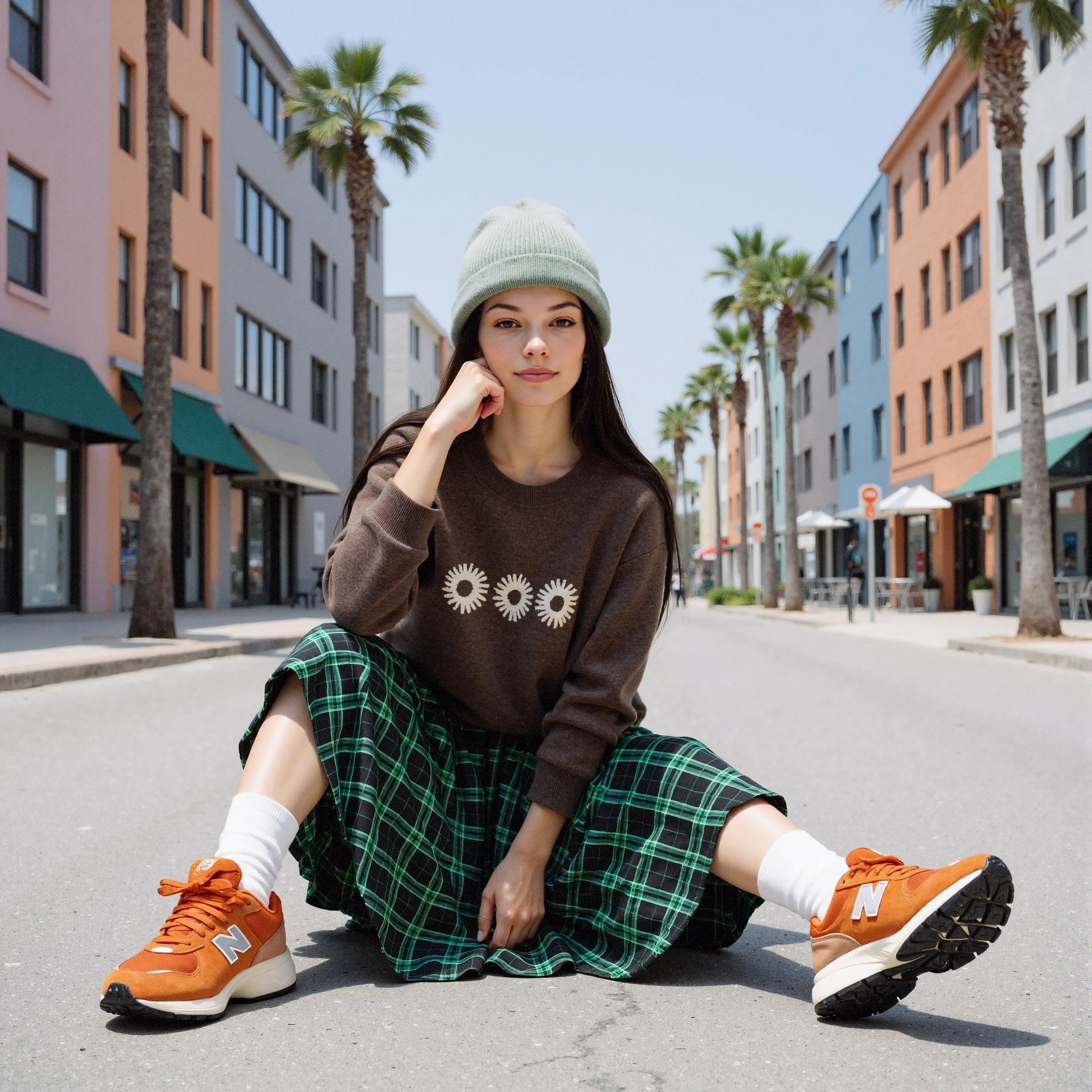 - 대비(Contrast) 효과: LA의 맑고 푸른 하늘과 팝한 컬러의 건물들은 모델의 차분한 브라운 니트와 강렬한 대비를 이룹니다. 이러한 배경 색감의 대비는 인물을 더욱 입체적으로 보이게 하며, 룩북의 시각적 재미를 더합니다.