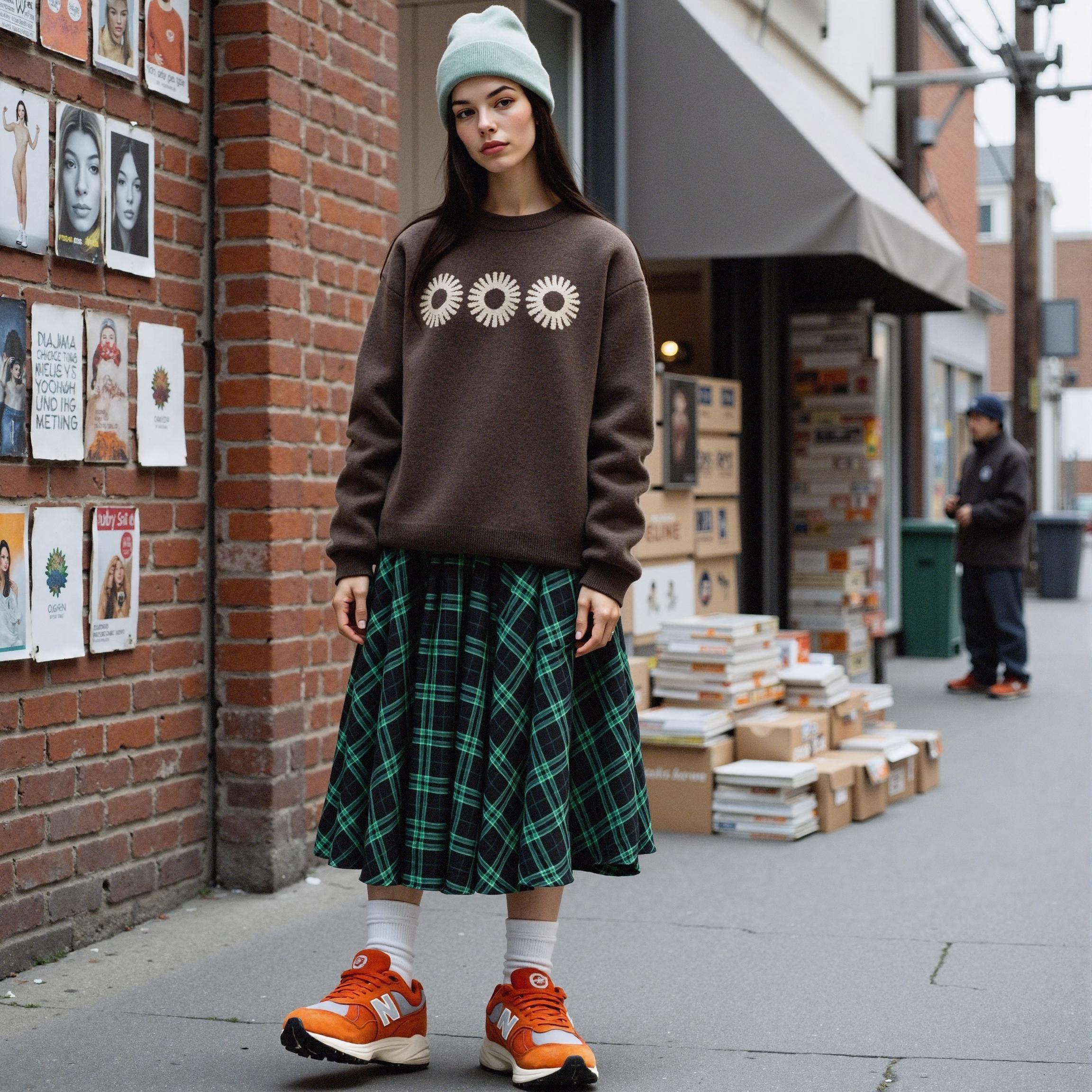 - 브라운 & 그린의 조화: 모델이 착용한 데이지 자수 니트와 타탄체크 스커트는 전형적인 '어스 톤' 조합입니다. 색채 심리학적으로 갈색은 흙과 나무를 상징하며 신뢰와 안정을, 녹색은 숲과 생명력을 상징합니다. 이 두 컬러의 매치는 눈의 피로도를 낮추고 보는 이로 하여금 편안함을 느끼게 합니다.