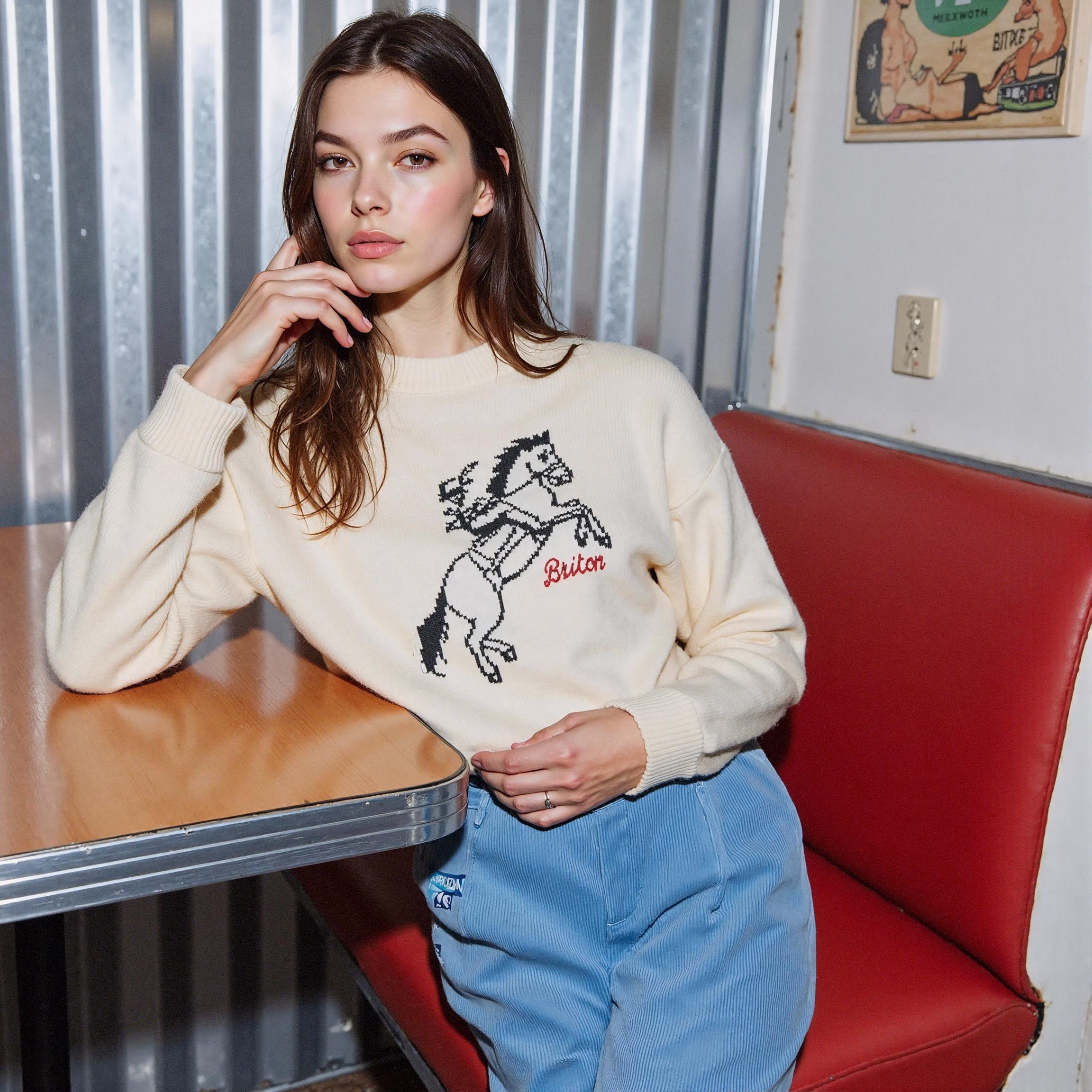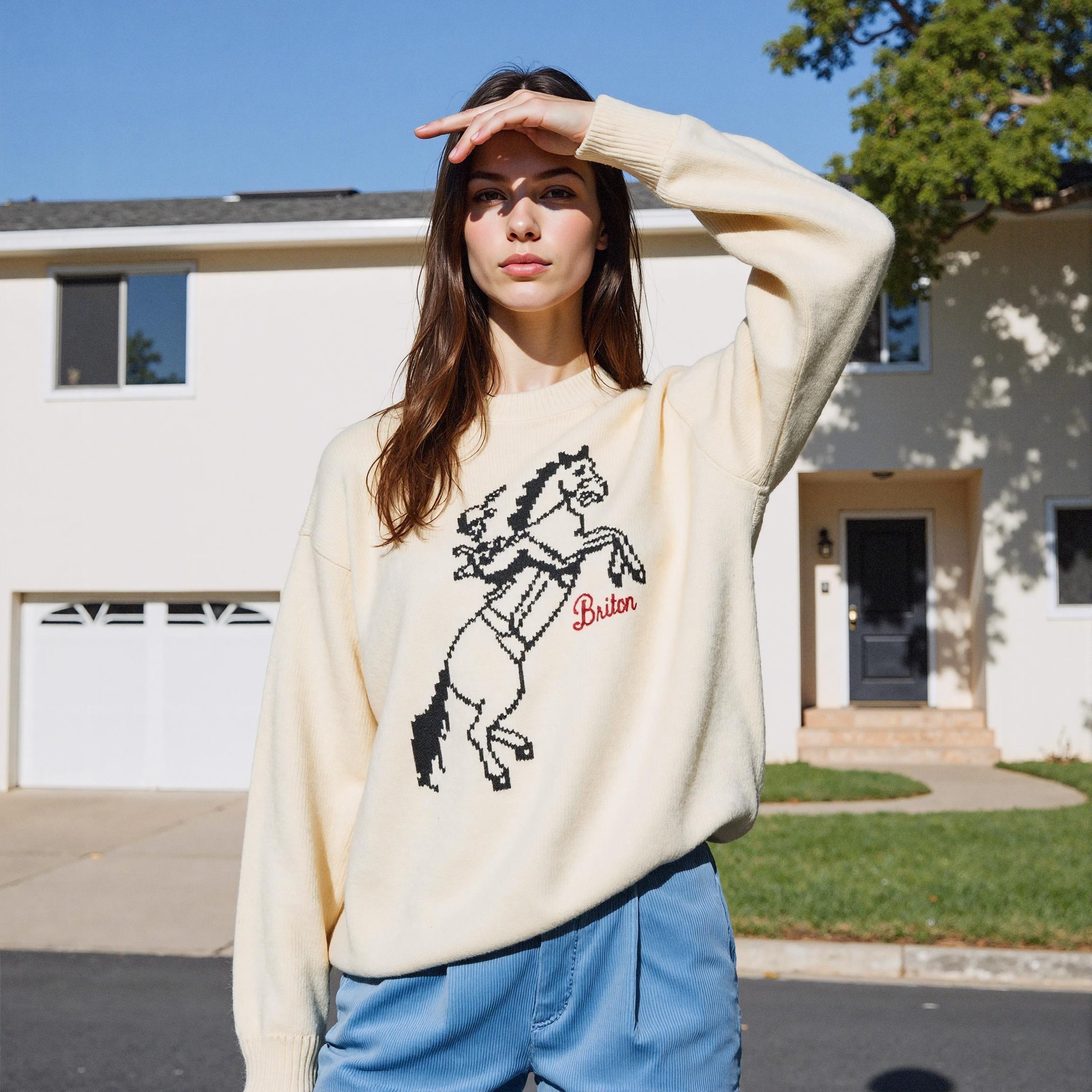 패션 커머스에서 가장 치명적인 AI 오류는 의상의 왜곡입니다. 그러나 LaonGEN이 생성한 이미지 속 'Briton' 니트를 주목해 주십시오. 복잡한 말(Horse) 그래픽 아트웍과 붉은색 레터링의 위치, 크기, 비율이 모든 앵글에서 완벽하게 유지됩니다.