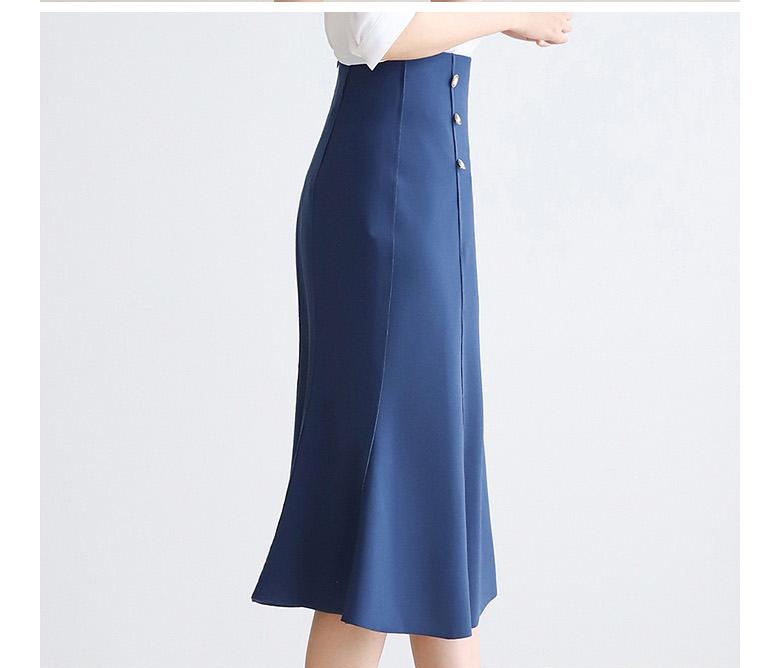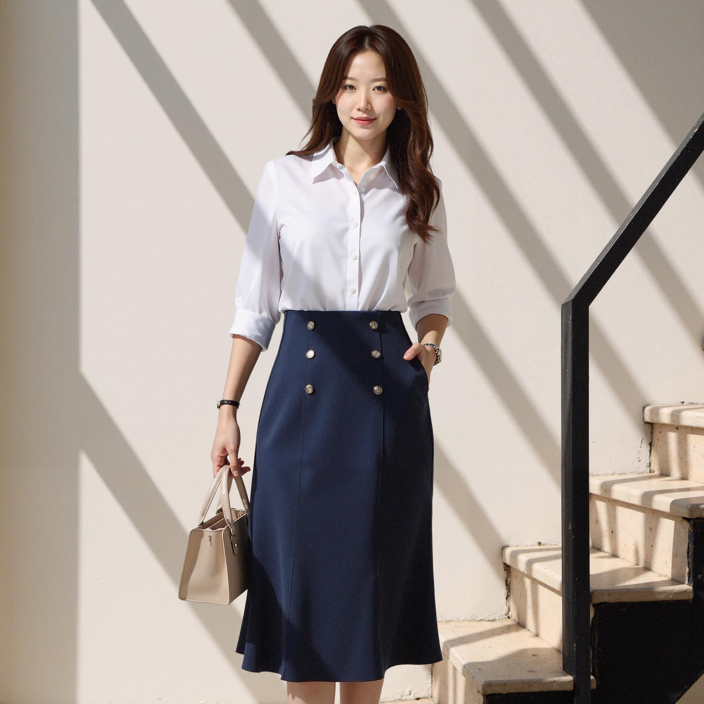 먼저 촬영된 기존 이미지들을 보면, 네이비 컬러의 더블 브레스트 스커트가 메인 아이템이었어요.