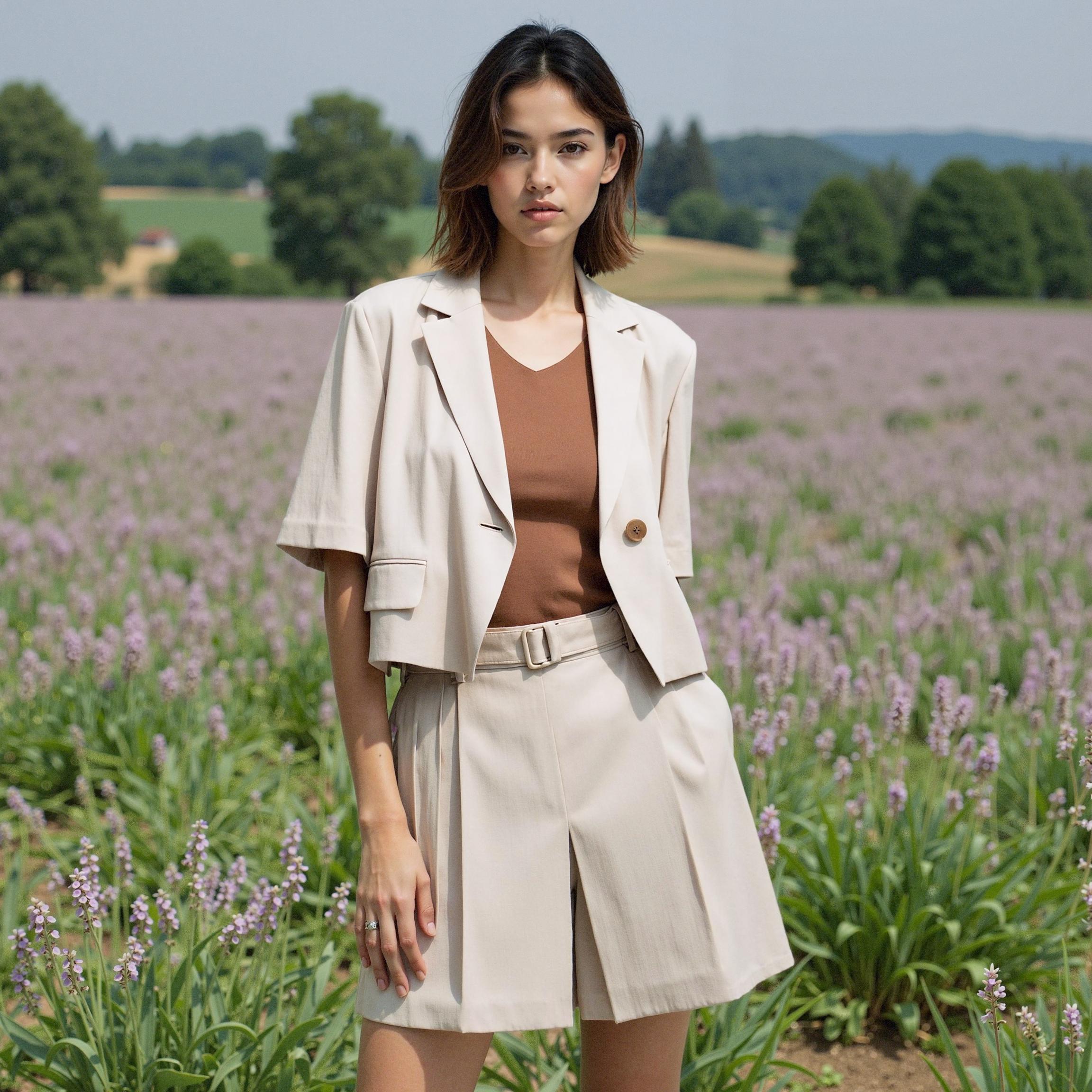 자연광이 풍부한 꽃밭이나 들판에서의 촬영은 미쏘 크롭 자켓의 베이지 컬러를 더욱 부드럽고 고급스럽게 표현합니다. 브라운 톤의 이너웨어와 매치하면 톤온톤 코디네이션으로 우아한 분위기를 연출할 수 있습니다.