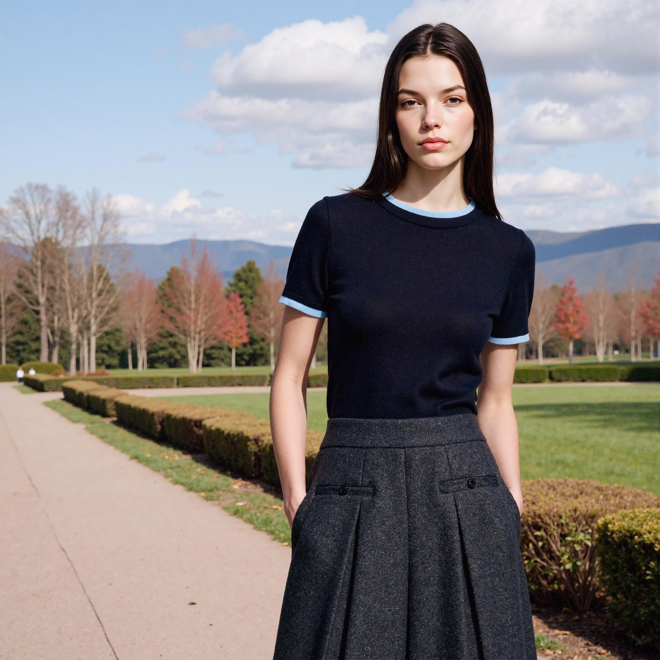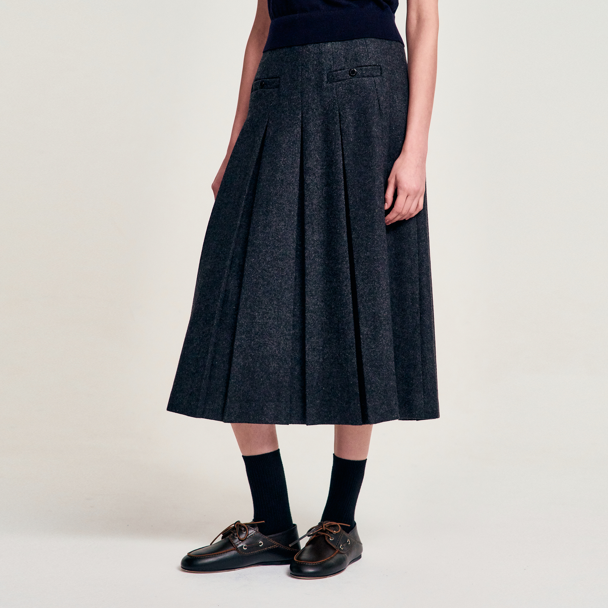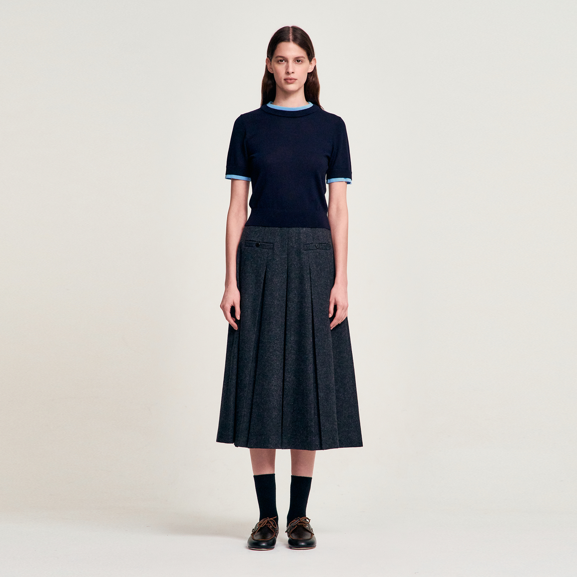 LaonGEN은 이번 작업에서 네이비 니트 톱과 차콜 플리츠 스커트 조합을 중심으로