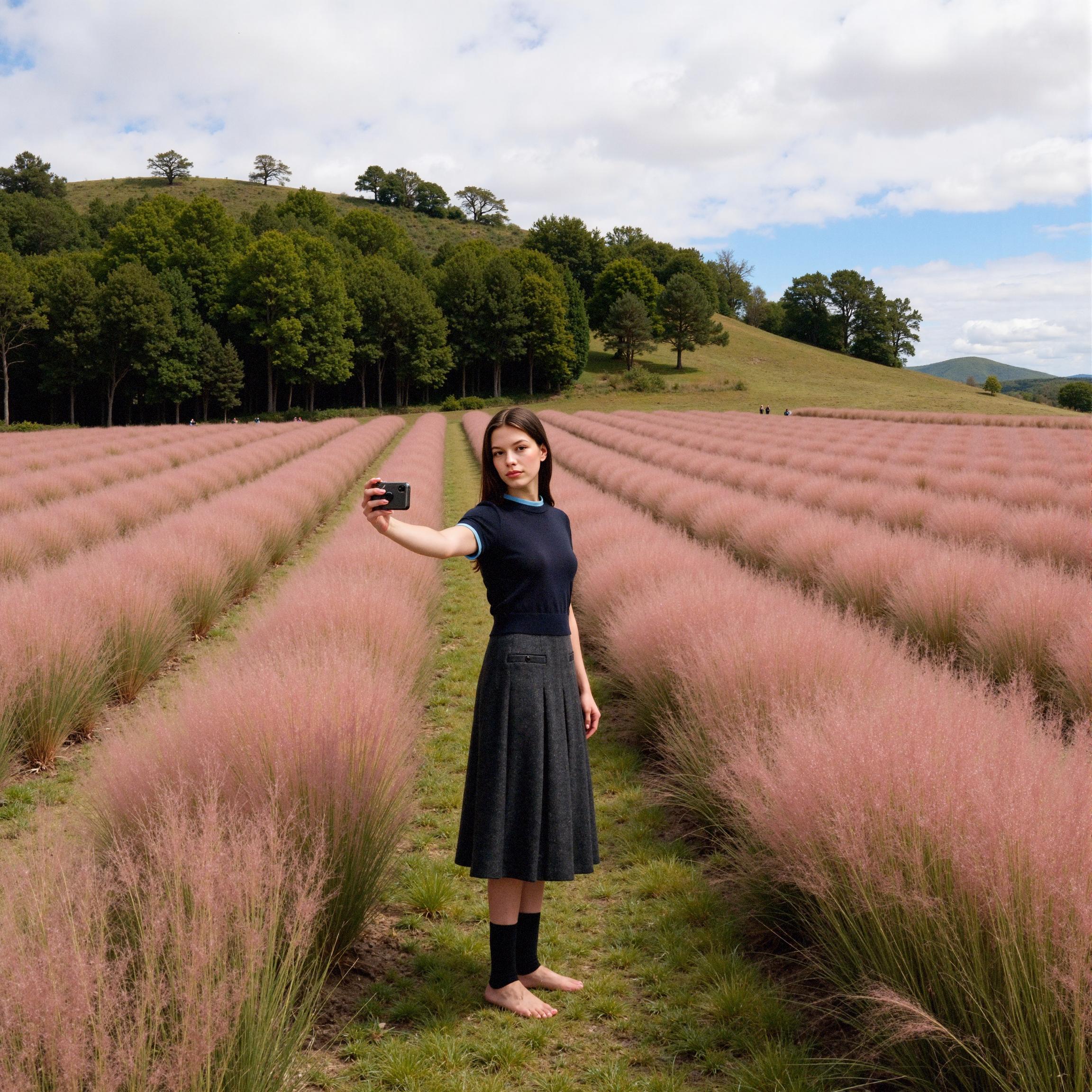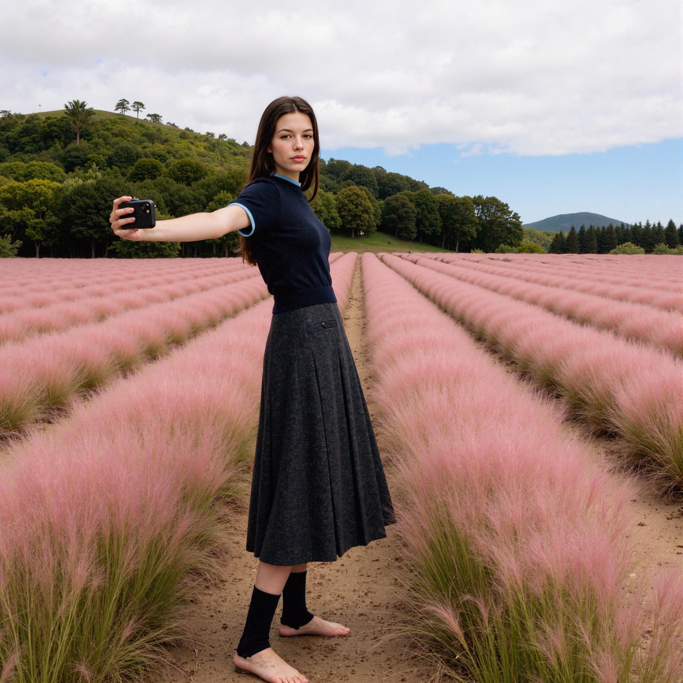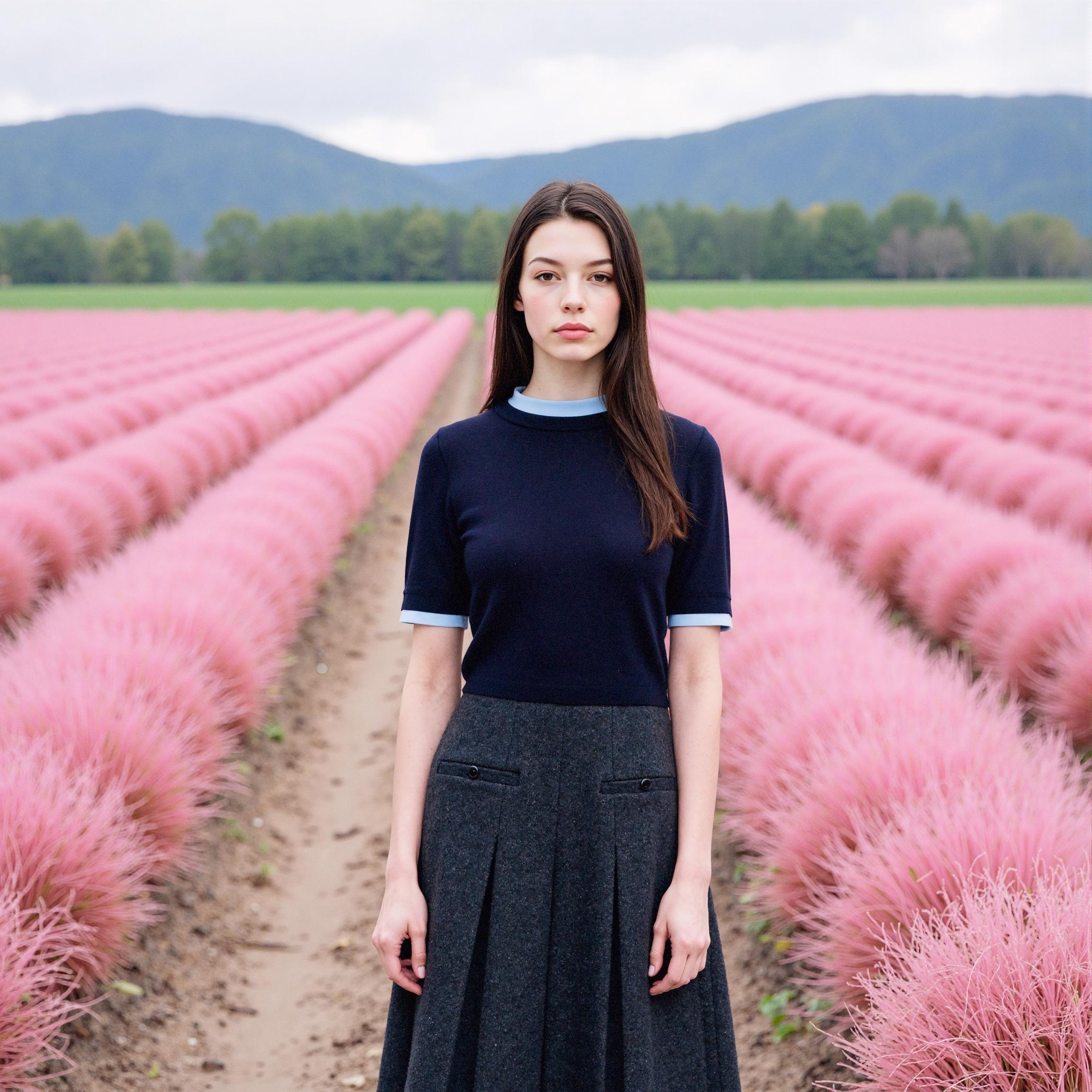 LaonGEN은 이번 작업에서 네이비 니트 톱과 차콜 플리츠 스커트 조합을 중심으로