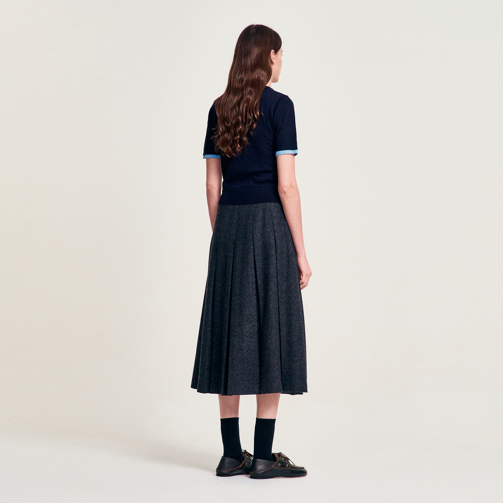 니트 소재의 밀도와 플리츠의 구조적 리듬이 대비되며,