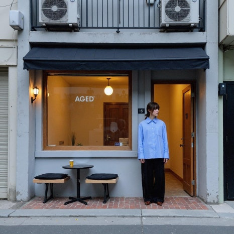 자연광이 드리운 도시 속 배경과 어우러지는 하시에 셔츠의