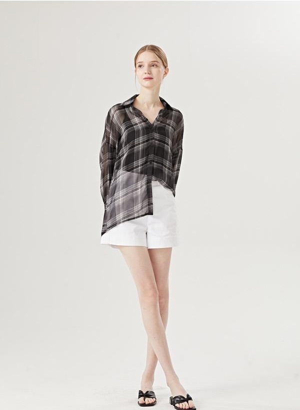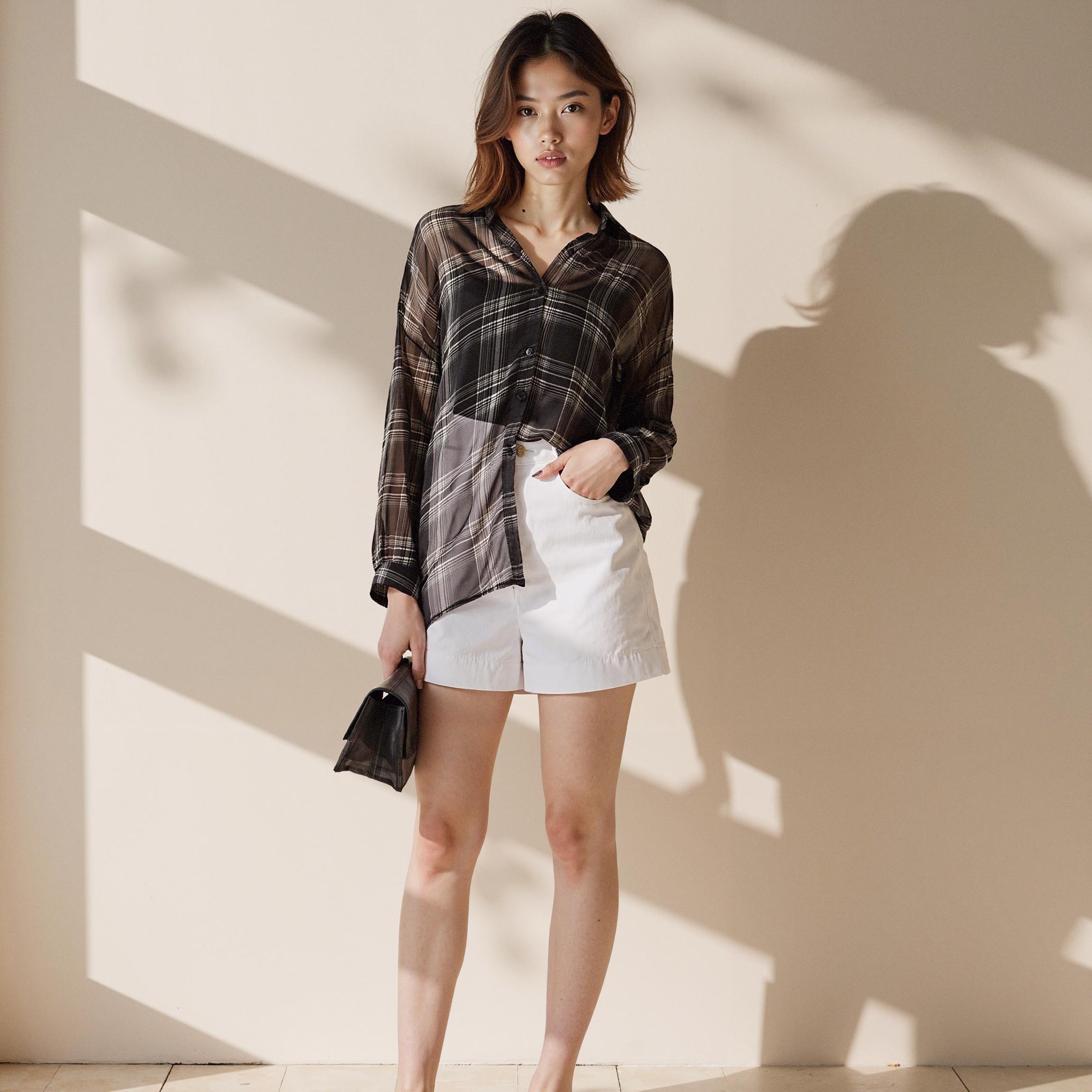 첫 번째 시나리오에서는 일상적인 거리 환경에서 TANKUS 체크 블라우스를 연출했습니다. 클래식한 체크 패턴과 화이트 쇼츠의 조합이 캐주얼하면서도 세련된 도시적 감성을 자아냈습니다.