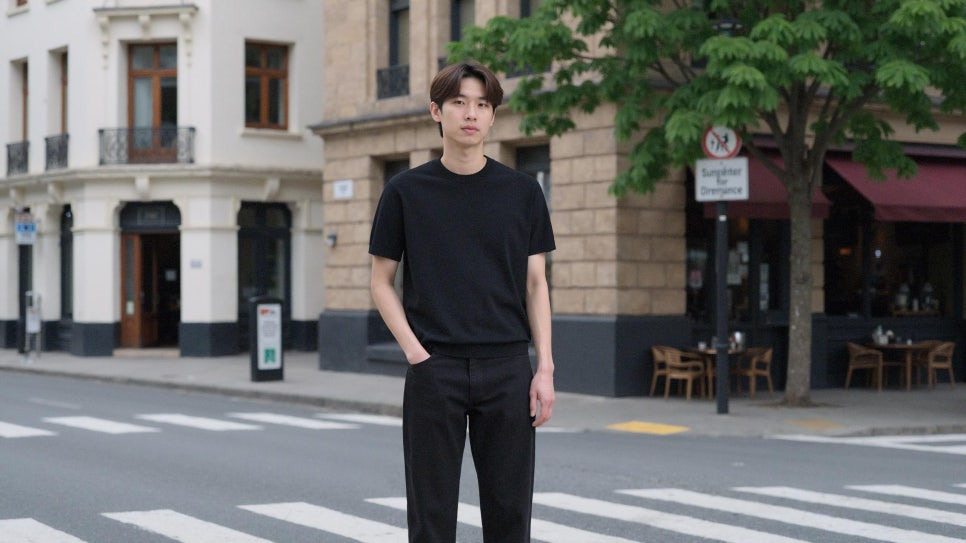 이번에는 **Maison Margiela(메종 마르지엘라)**의 청청패션 티셔츠와 바지를 LaonGEN 이용해 패션 화보로 만들어봤습니다.전통을 해체하고 재구성하는 메종 마르지엘라의 철학이 담긴 이번 컬렉션을 A