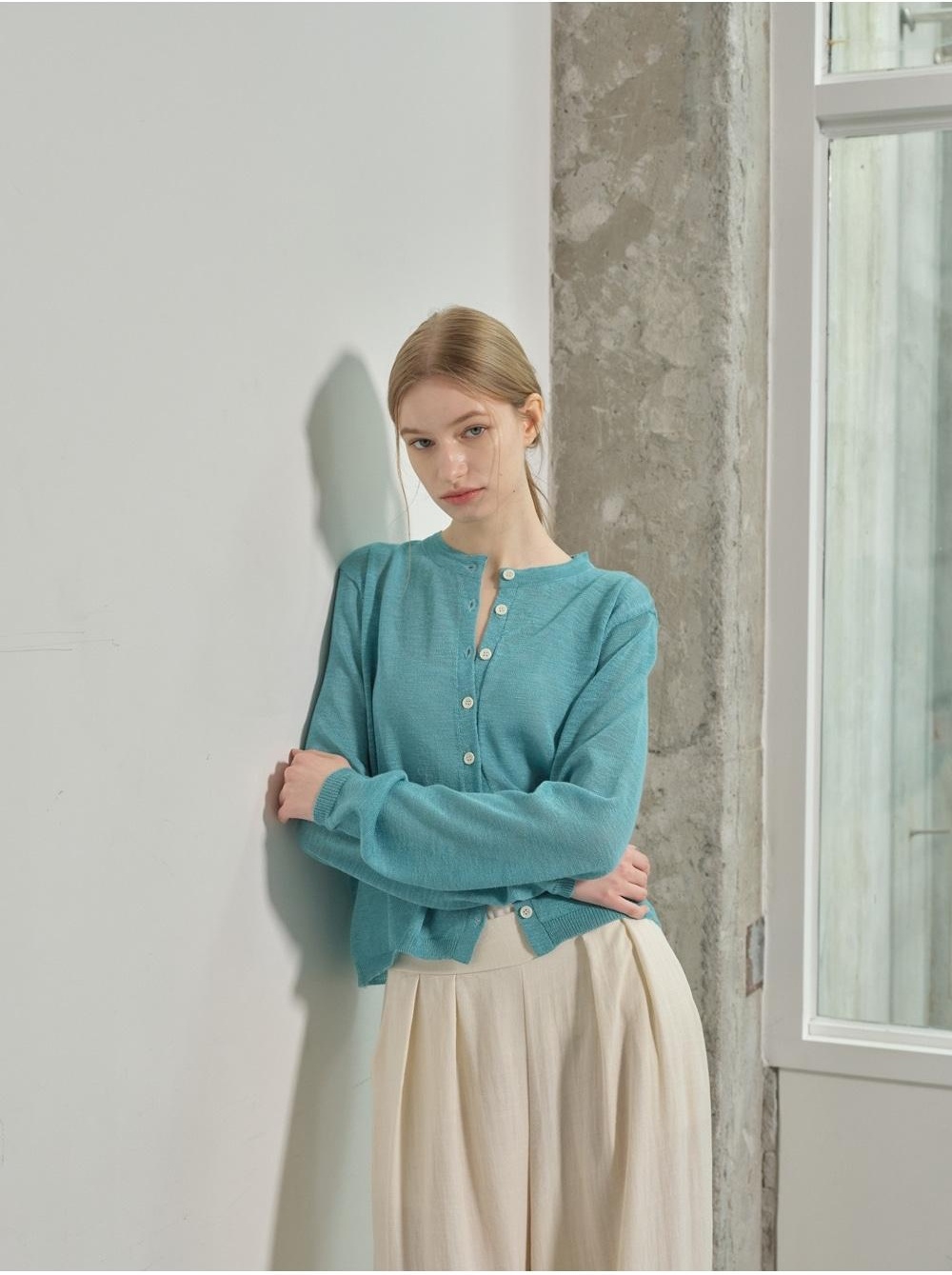 화이트 팬츠와 매치된 심플한 스타일링, 자연광을 활용한 담백한 배경,