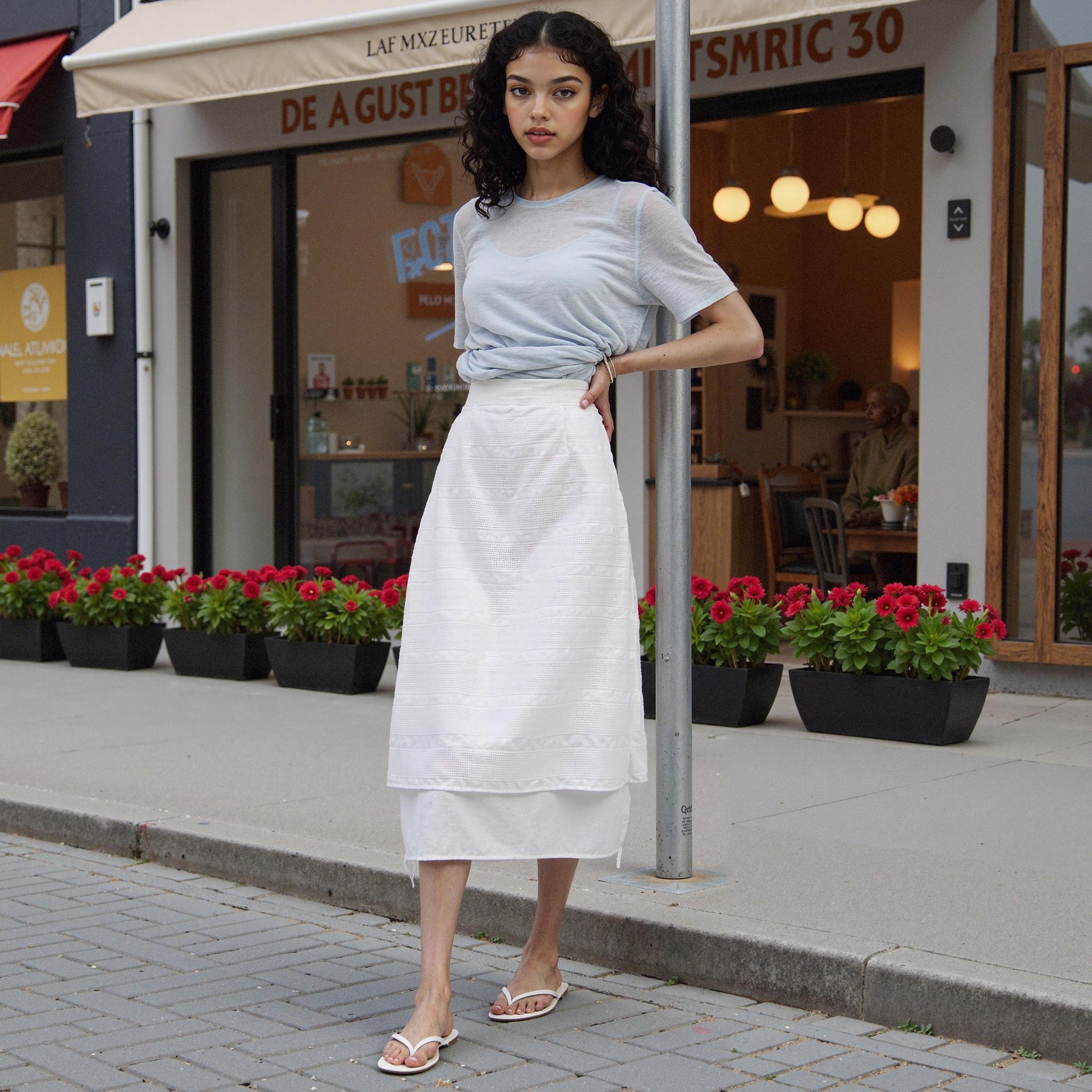 화이트 셔츠 대신 블랙 슬리브리스, 또는 니트 톤 상의로 대체하니 스커트의 슬릿 디테일과 레이어드 구조가 강조되며 시선이 집중되는 영역이 달라졌습니다.