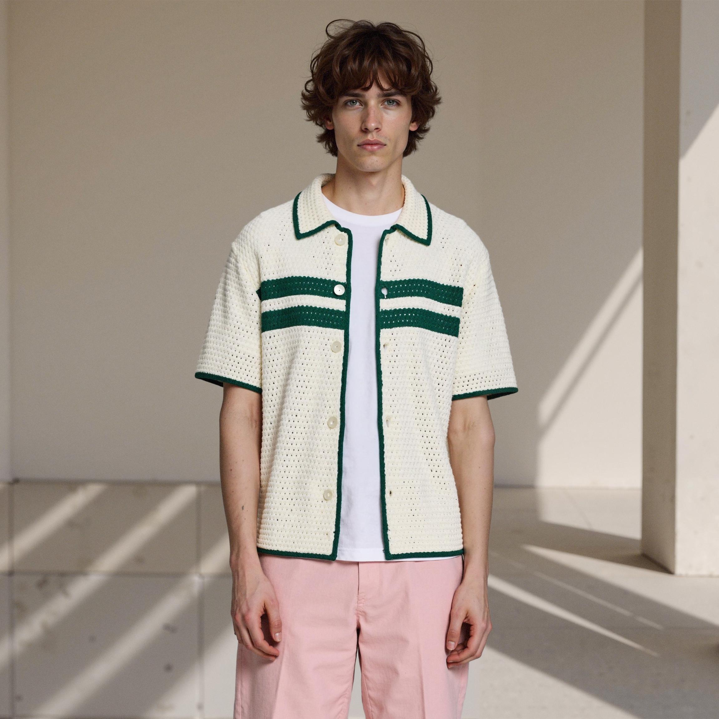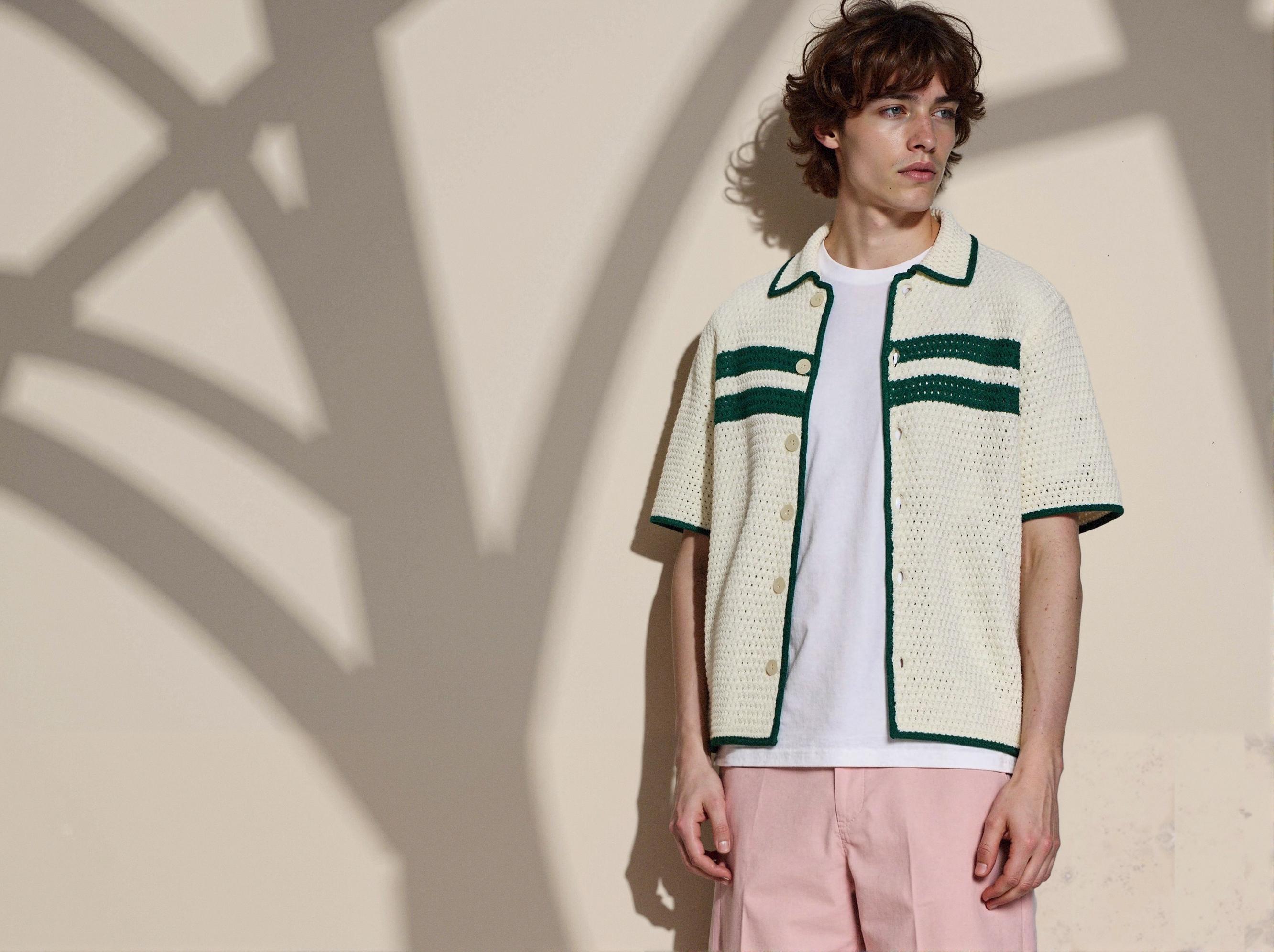 크림 베이스에 그린 포인트가 특징인 이 가디건의 경우, AI 기술을 통해 캐주얼 데일리룩부터 세미 포멀한 오피스 스타일까지 폭넓은 연출이 가능합니다. 같은 아이템임에도 불구하고 배경, 모델의 포즈, 조명 설정에 따라 완전히 다른 브랜드 무드를 표현할 수 있게 된 것입니다.