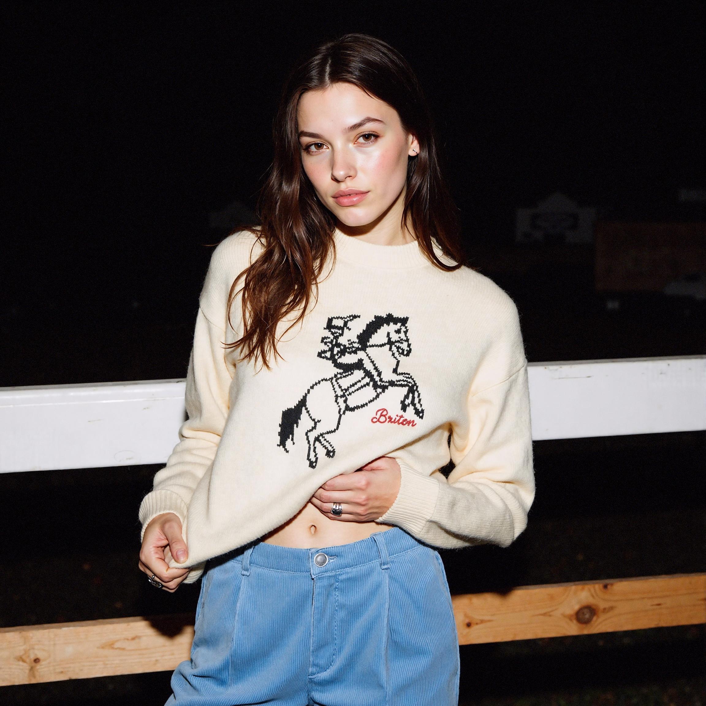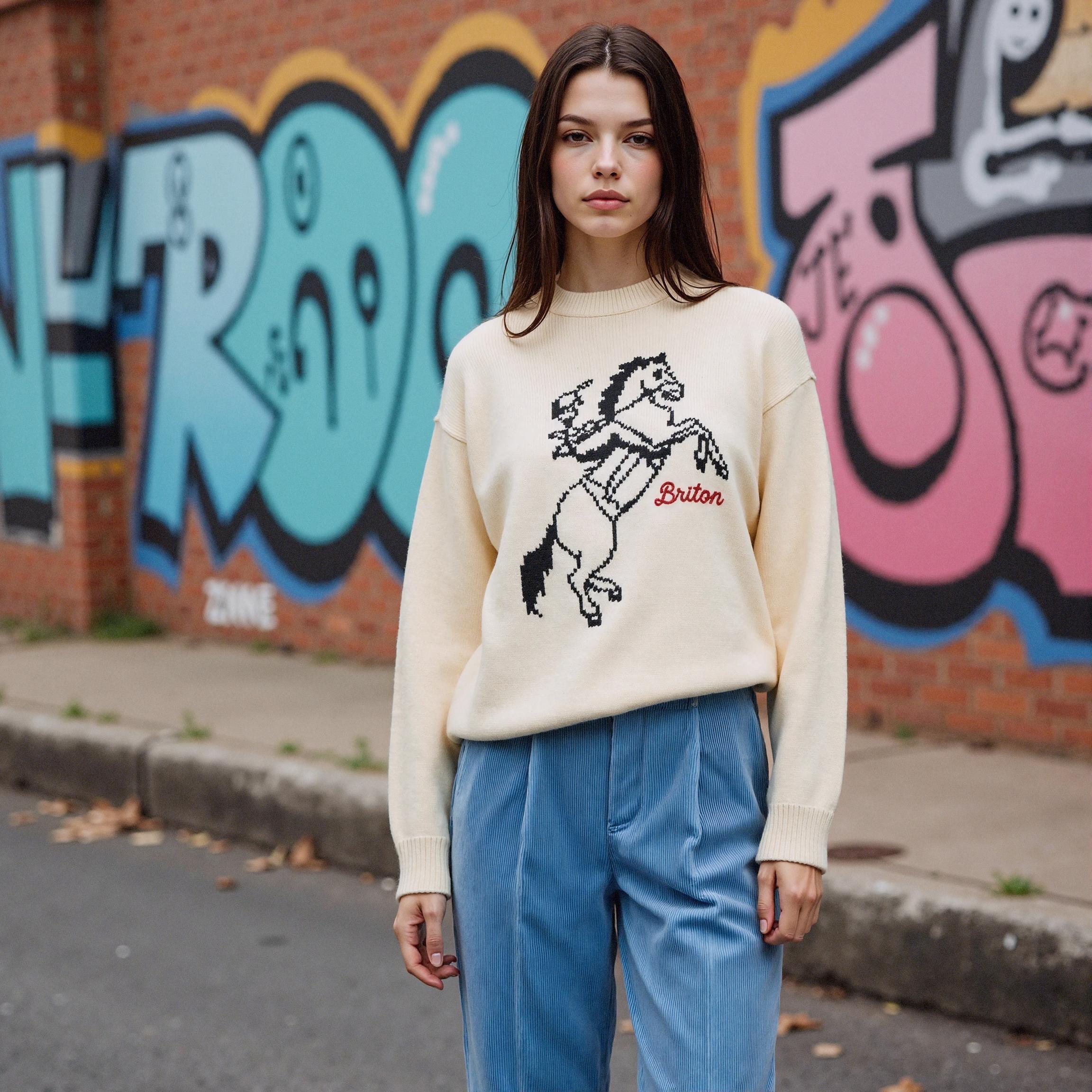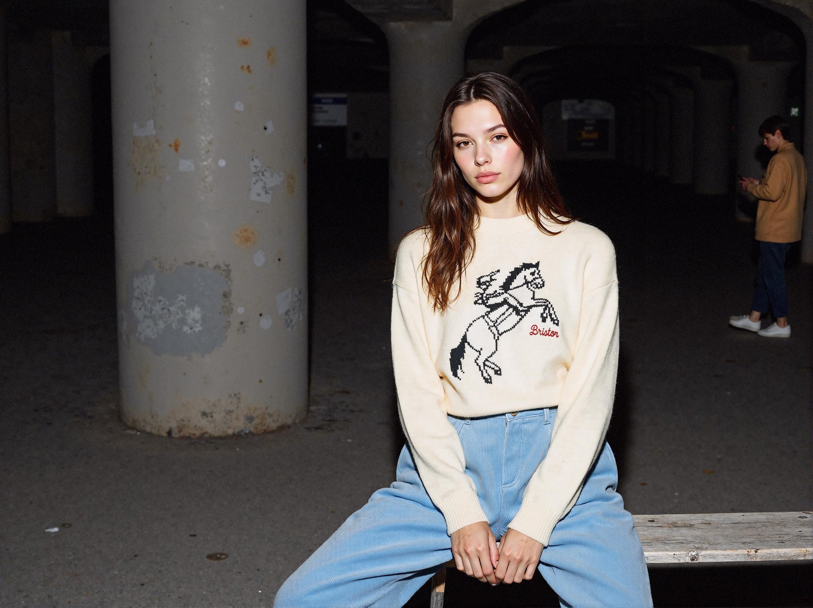 패션 커머스에서 가장 치명적인 AI 오류는 의상의 왜곡입니다. 그러나 LaonGEN이 생성한 이미지 속 'Briton' 니트를 주목해 주십시오. 복잡한 말(Horse) 그래픽 아트웍과 붉은색 레터링의 위치, 크기, 비율이 모든 앵글에서 완벽하게 유지됩니다.